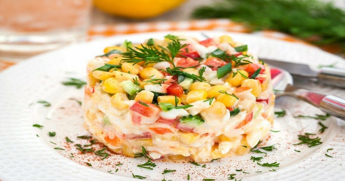Готовить нужно только яйца, все остальные составляющие уже готовы, поэтому времени и усилий на приготовление и подачу нужно выделить совсем немного. Можно добавить зелень. Ее либо рубят мелко и смешивают с остальными компонентами, либо украшают Все они мелко рубятся и смешиваются с соусом. сверху. Стоит обратить внимание, на то, что от качества составляющих зависит итоговый вкус блюда. Важно уделять тщательное внимание каждому компоненту. Кукуруза сахарных сортов будет мягкой по своей текстуре и придавать пикантную сладость. Крабовые палочки желательно подбирать от известных производителей – это является гарантией вкусовых качеств. Майонез высокого процента жирности придаст возможно и более насыщенного вкуса, но, вместе с тем и сделает блюдо калорийней. Если у свежего огурца излишне жесткая шкурка, ее стоит тонко снимать ножом.
