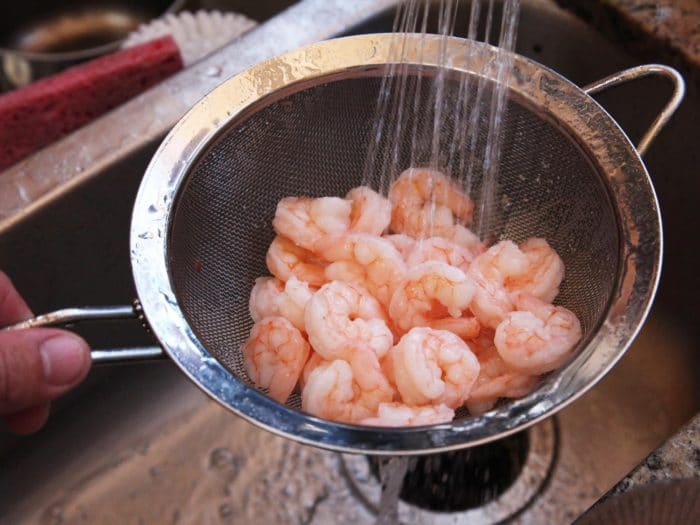 - Очищенные креветки лучше опустить в воду, чтобы вымылись остатки внутренностей. Через несколько минут промыть под струей воды, дать стечь в воде.