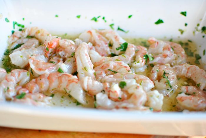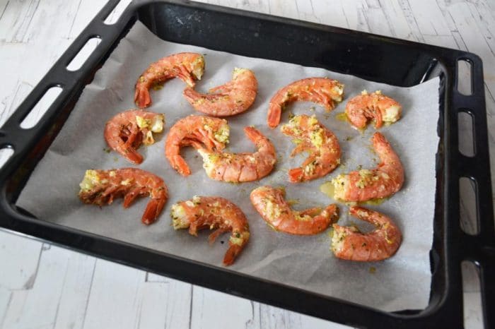 - Очищенные тигровые креветки взбрызнуть небольшим количеством оливкового масла.