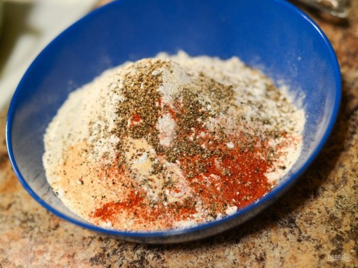 В специи добавить муку и немного соли. Высыпать равномерно специи на креветки