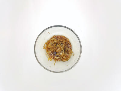 Лук почистите и нарежьте полукольцами. Обжарьте в растительном масле на среднем огне с щепоткой соли и сахаром 7-8 минут до карамелизации. Затем переложите лук в миску, залейте соевым соусом и Мирином, перемешайте и отставьте в сторону.