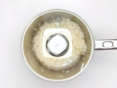 Выложите рис в сито и промойте холодной водой, дайте воде полностью стечь. Затем переложите в кастрюлю с щедрой щепоткой соли и 200 мл воды. На сильном огне доведите до кипения.