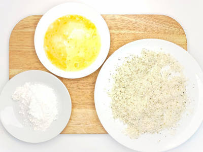 В тарелку выложите муку с щепоткой соли. В другую тарелку насыпьте сухари. В отдельной миске взбейте куриное яйцо вилкой.
