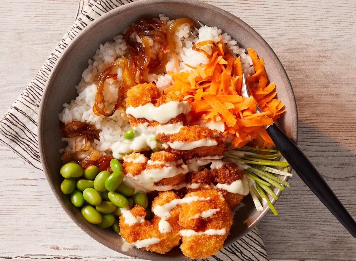 Этот вариант боула с креветками — традиционное блюдо японцев, в основе которого лежит липкий рис для суши с разнообразными топингами.