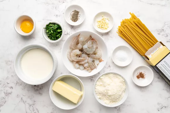 Подготовьте ингредиенты для приготовления фетучини с креветками в сливочном соусе.