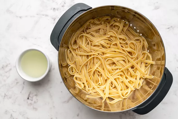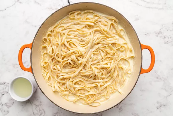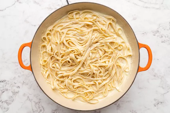 Когда соус немного загустеет, а паста будет готова, добавьте её на сковородку. Перемешайте, чтобы фетучини были полностью покрыты сливочным соусом. Попробуйте и посолите, если необходимо.