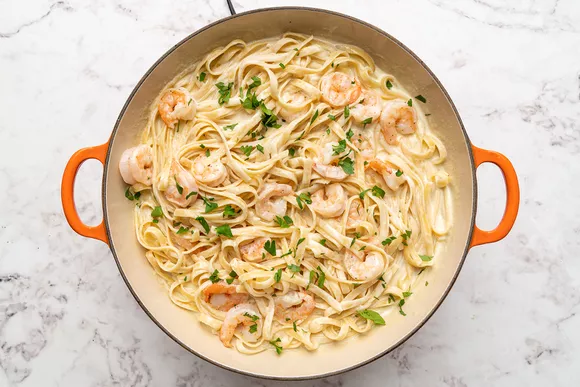 Феттуччине — идеальная паста для этого рецепта, поскольку соус прилипает к плоской длинной лапше и равномерно распределяется. Креветки добавляют мясной пикантный элемент, который прекрасно сочетается с соусом. Сливки же придают ему неотразимую насыщенность, которую просто невозможно превзойти.