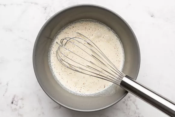 В миске среднего размера взбейте вместе жирные сливки, яичный желток и мускатный орех.
