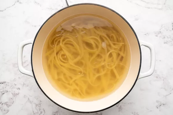 Доведите до кипения большую кастрюлю воды. Как только вода закипит, посолите её и добавьте фетучини. Перемешайте и варите в соответствии с инструкциями на упаковке до состояния «аль денте».