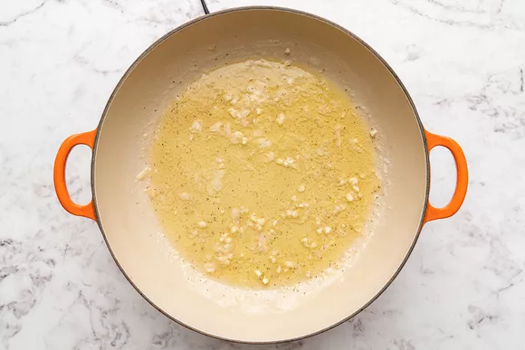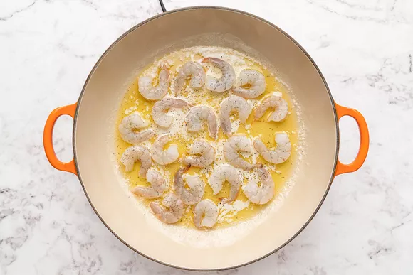 Пока готовится паста, разогрейте большую сковороду или сотейник на среднем огне. Добавьте сливочное масло и дайте ему растаять. Затем добавьте креветки в один слой и готовьте, пока они не станут розового цвета с нижней стороны (2-3 минуты). Приправьте солью и перцем.