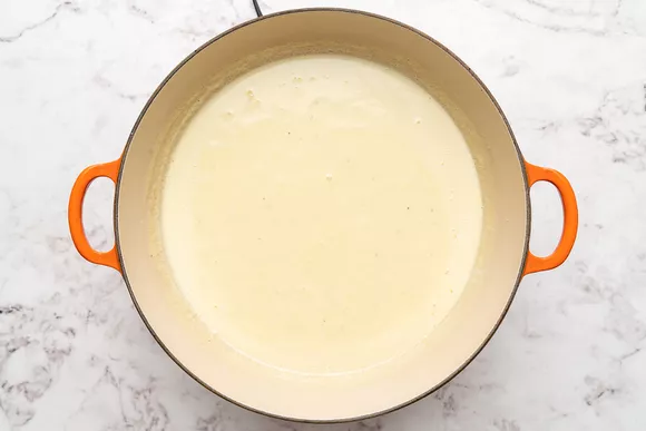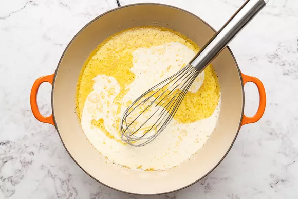 Добавьте на сковороду смесь сливок с желтком и взбейте ее венчиком. Готовьте, часто помешивая, пока она не станет горячей, но не доводите до кипения. Если нужно, переключите на медленный огонь.