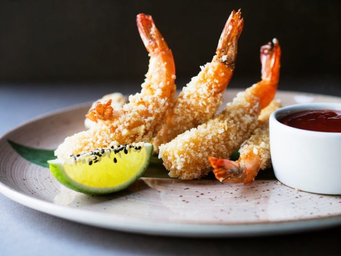 Креветки очистить и опустить их в кляр. Посыпать сухарями