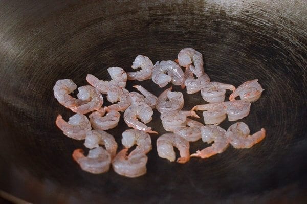 Поставьте на огонь сковороду вок, влейте в нее столовую ложку растительного масла. Когда масло начнет дымить, выложите в него креветки и обжарьте их в течение 15 секунд с обеих сторон. Выложите креветки на тарелку.