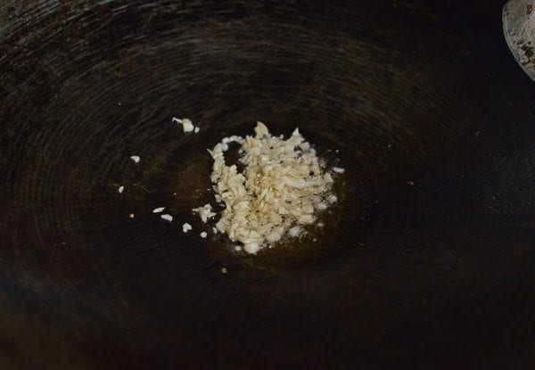 Приготовьте соус: соедините в миске сахар, устричный и соевые соусы, кунжутное масло, белый перец и тщательно размешайте. Отложите в сторону. Добавьте в вок оставшееся растительное масло и измельченный чеснок, увеличьте огонь до максимума.