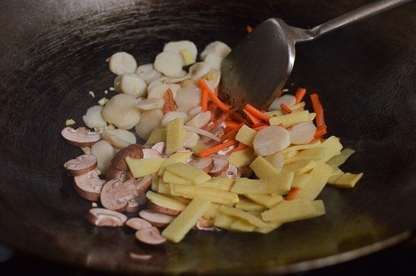 Далее выложите в сковороду побеги бамбука, шампиньоны, морковь и водяные каштаны, жарьте около 30 секунд, постоянно помешивая.