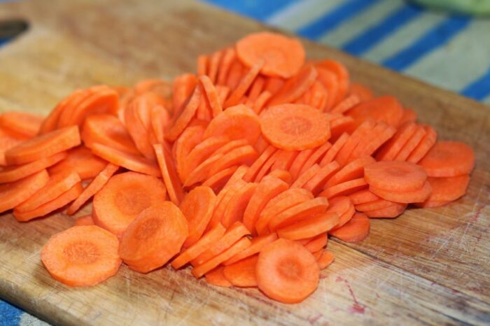 Для того чтобы сделать действительно вкусное блюдо, плов не получился излишне суховатым, потребуется как можно больше овощей. Поэтому морковку и лучок почистить и нарезать крупно. Морковку лучше не измельчать на терке, а лучок нарубить на крупные полукольца.