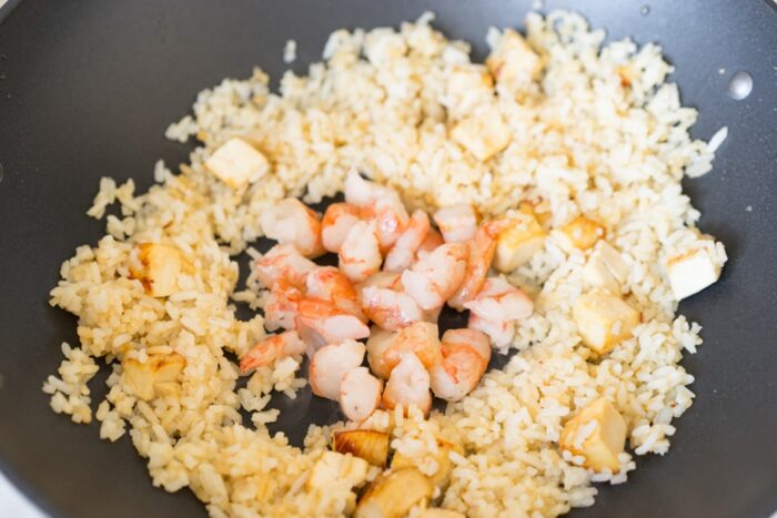 Морепродукты почистить и обжарить на отдельной небольшой сковороде, полить несколькими столовыми ложками соевого соуса, примерно как на следующем фото.