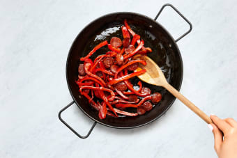 Нагрейте капельку оливкового масла в большой сковороде на средне-высоком огне. Добавьте болгарский перец и чоризо. Готовьте, периодически помешивая, пока перец не станет немного мягче, а чоризо слегка подрумянится (2-3 минуты).