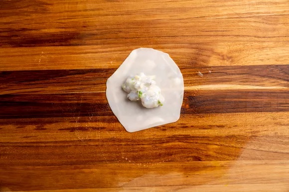 Положите чайную ложку с горкой начинки в центр круга из теста. Равномерно распределите, оставьте пустые края.