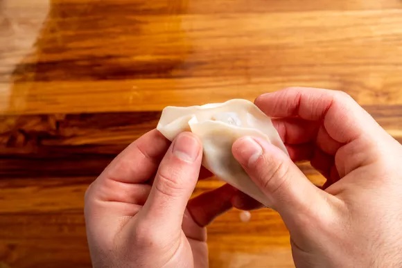 Одним краем накройте начинку, чтобы получился полукруг. Пальцами защипните края, формируя складки.