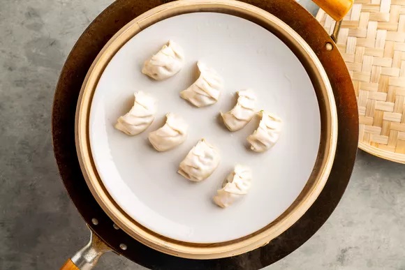 Внутрь бамбуковой пароварки выложите тарелку, смазанную маслом. На тарелку поместите пельмени с креветками, накройте. Поставьте бамбуковую пароварку поверх кипящей воды в сковороде. Готовьте партиями примерно по 13-15 минут. Также можно установить такую пароварку поверх кастрюли с кипятком. Еще пельмени можно просто сварить в кипящей воде, приготовить в обычной пароварке или мультиварке или даже пожарить — выбирайте на свой вкус и в зависимости от наличия оборудования.