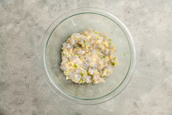 Креветки промойте и обсушите, затем мелко порубите ножом, также измельчите зеленый лук и бамбук. В глубокую посуду выложите все ингредиенты для начинки пельменей. Тщательно перемешайте руками.