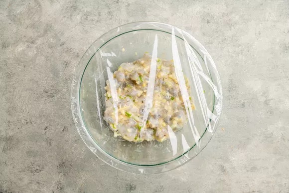 Накройте миску пищевой пленкой и уберите начинку на 60 минут в холод.