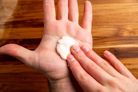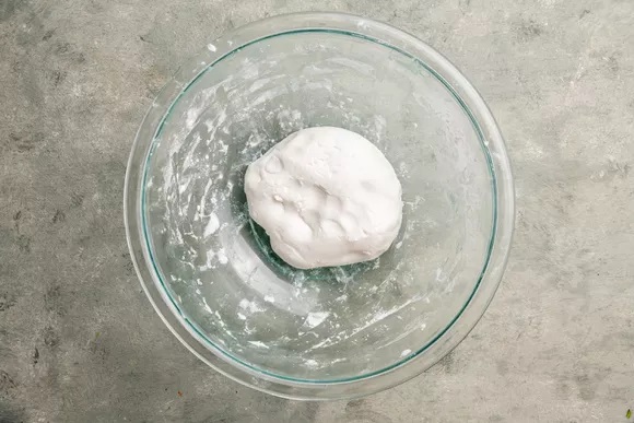 Если оно получилось сухое и рвется при растягивании, добавьте еще 40-60 мл кипятка. Месите тесто, пока оно не станет гладким.