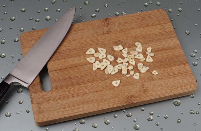 - Очистите, порубите маленькими кусочками чеснок.