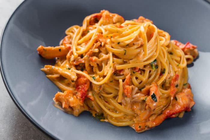 Реже к лангустинам готовится паста. Она подразумевает так же приготовление сливочного, сливочно-чесночного, чесночного соуса. Такое сочетание является самым распространенным из-за его высоких вкусовых качеств. Время приготовления такого рецепта не сильно разнится с классическим, но больше подходит для домашних ужинов.