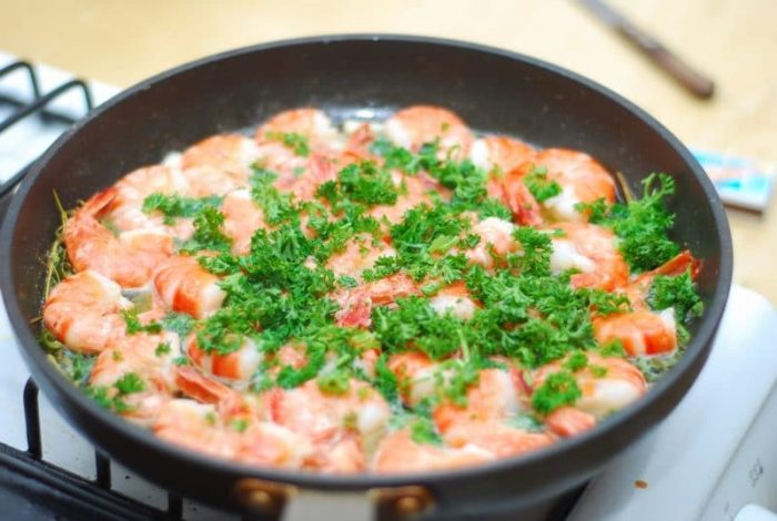 Очищенные лангустины добавляются в соус, тщательно перемешиваются, сверху крошится зелень. Выключить огонь, оставить блюдо настаиваться еще 4-5 мин.