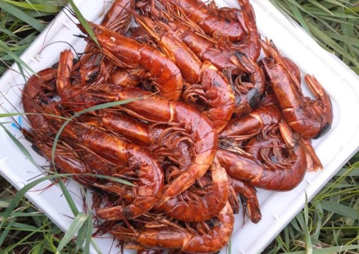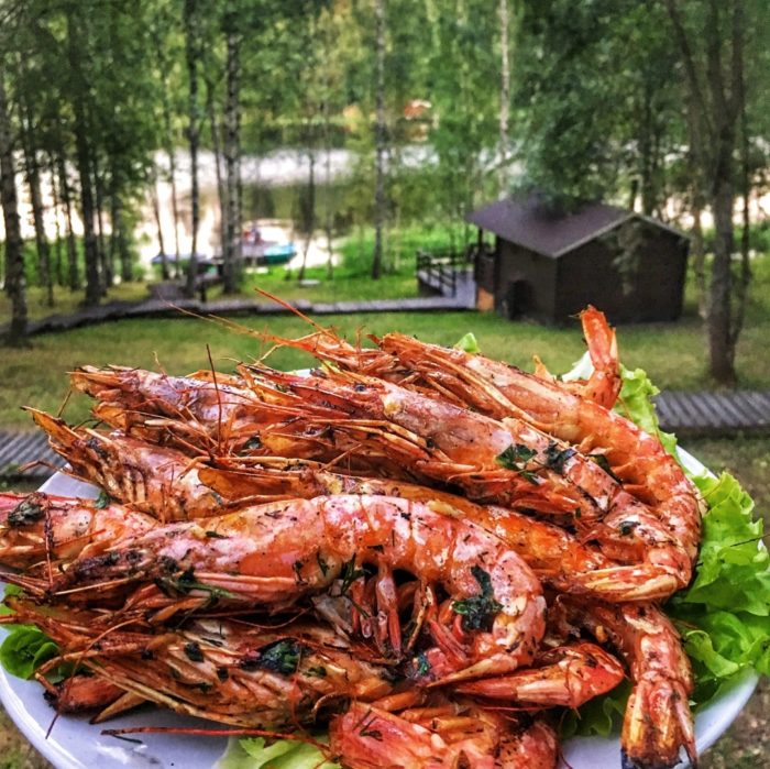 - Далее развести огонь, установить коптильню, особое внимание следует обратить на тип опилок. В зависимости от типа древесины, итоговый вкус копченых лангустинов может отличаться. Рекомендуется использовать опилки фруктовых деревьев. Уложить на решетку креветки, коптить при закрытой крышке 15 мин.