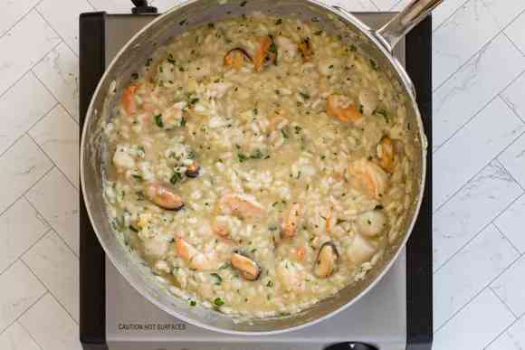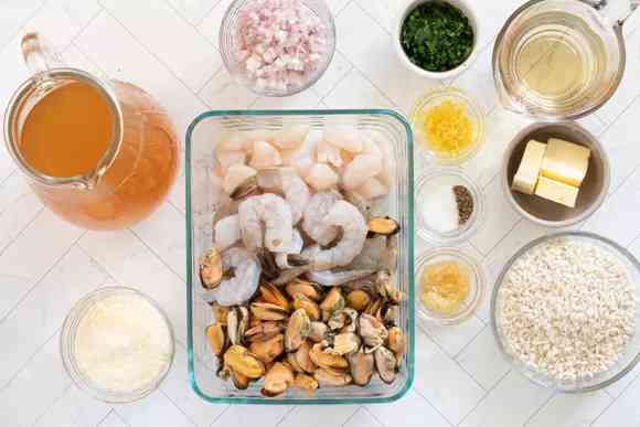Идеальным вариантом будет качественный бульон из морепродуктов, но вы можете использовать простой рыбный или овощной, если он есть более доступен. Готовые покупные бульоны могут быть солеными, поэтому обязательно попробуйте готовое ризотто на вкус, прежде чем приправлять его.
