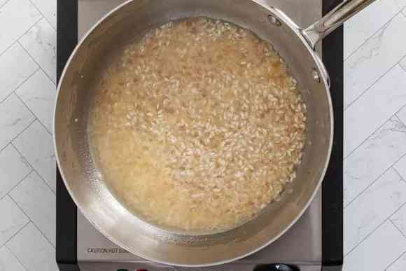 Вылейте в сковороду белое вино. Помешивайте, пока оно практически полностью не впитается в крупу.