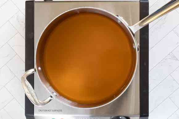 Бульон перелейте в кастрюлю, поставьте на плиту и доведите до кипения. Затем просто поддерживайте его теплым.