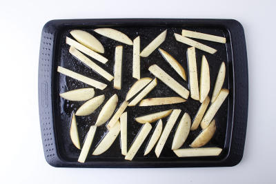 Духовку заранее за 5-10 минут нагрейте до 220 градусов. Картошку промойте и порежьте на брусочки (можно вместе со шкуркой, если она молодая). Равномерно распределите ее по противню, немного полейте маслом, посолите и поперчите. Запекайте около 25 минут, пока она не пропечется.