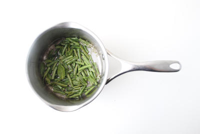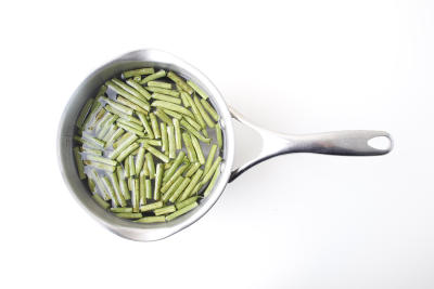 Фасоль крупно нарежьте, отправьте в кастрюлю с кипящей подсоленной водой на 3-4 минуты, затем промойте под холодной водой и отложите.