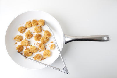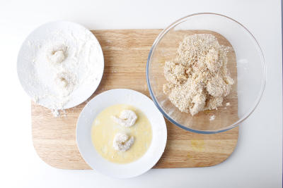 В тарелке смешайте панировочные сухари с щепоткой соли и кайенским перцем. В другую миску разбейте яйцо и слегка взбейте его вилкой. В третью тарелку высыпьте муку. Каждую креветку обваляйте сначала в муке, затем окуните в яйцо, а потом – в панировочные сухари.