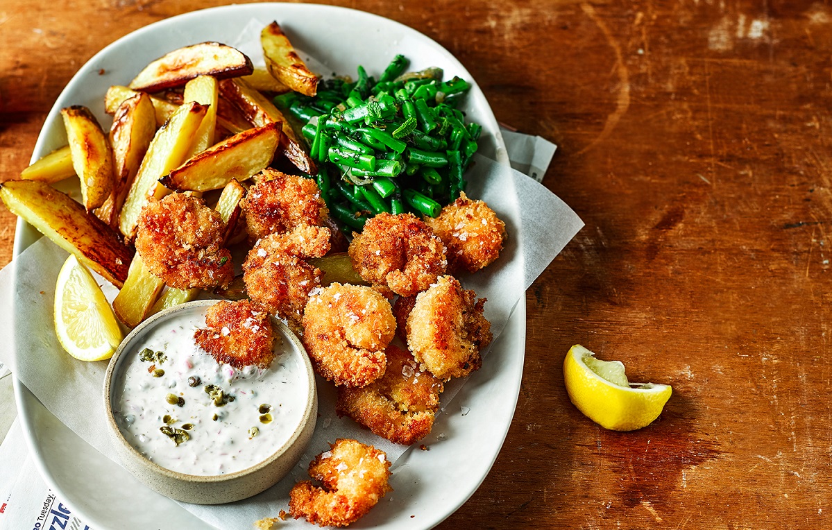 Вкусный и полезный фастфуд прямо у вас на кухне. Приготовьте жареные королевские креветки в панировочных сухарях. Картошку дольками запеките в духовке. А стручковую фасоль с луком томите в сливочном масле. И обязательно подайте соус тартар собственного приготовления.