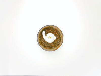 В чашу блендера или кухонного комбайна сложите петрушку, кинзу, чеснок, сок половины лимона, тмин, паприку, кайенский перец, 2,5 столовые ложки оливкового масла, по щепотке соли и перца. Измельчите до однородности.