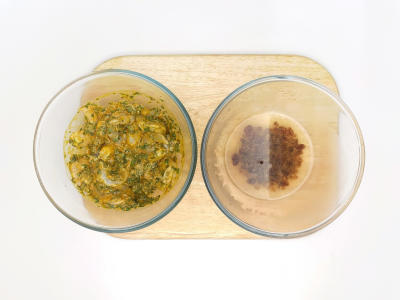 Затем в получившийся маринад выложите креветки, тщательно их перемешайте и оставьте мариноваться. Изюм порубите и залейте кипятком, отставьте в сторону.