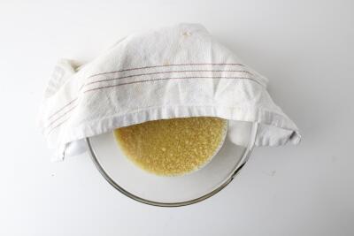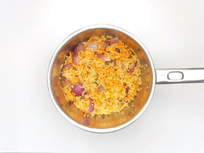 Добавьте кускус в кастрюлю, залейте 200 мл кипятка, посолите, накройте и оставьте.