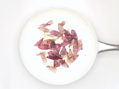 Красный лук очистите и разделите на лепестки. На средне-сильном огне нагрейте сковороду с небольшим количество оливкового масла. Добавьте лук с щепоткой соли и жарьте 5-8 минут до начала карамелизации.