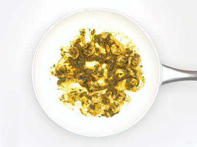 Сковороду верните на сильный огонь. Выложите креветки с маринадом и жарьте 4-5 минут до готовности.