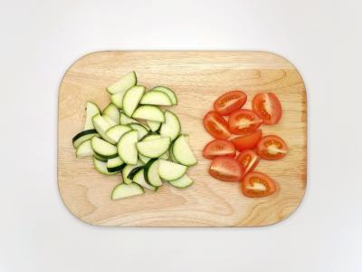 Кабачок нарежьте полукольцами. Помидоры нарежьте на дольки. Поставьте разогреваться сковороду с антипригарным покрытием на средне-сильный огонь с оливковым маслом.