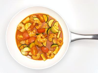 Креветки промойте и обсушите. Как только масло в сковороде нагреется, выложите креветки, кабачок и помидоры. Приправьте солью, перцем и хлопьями чили. Перемешайте и жарьте 2 минуты.