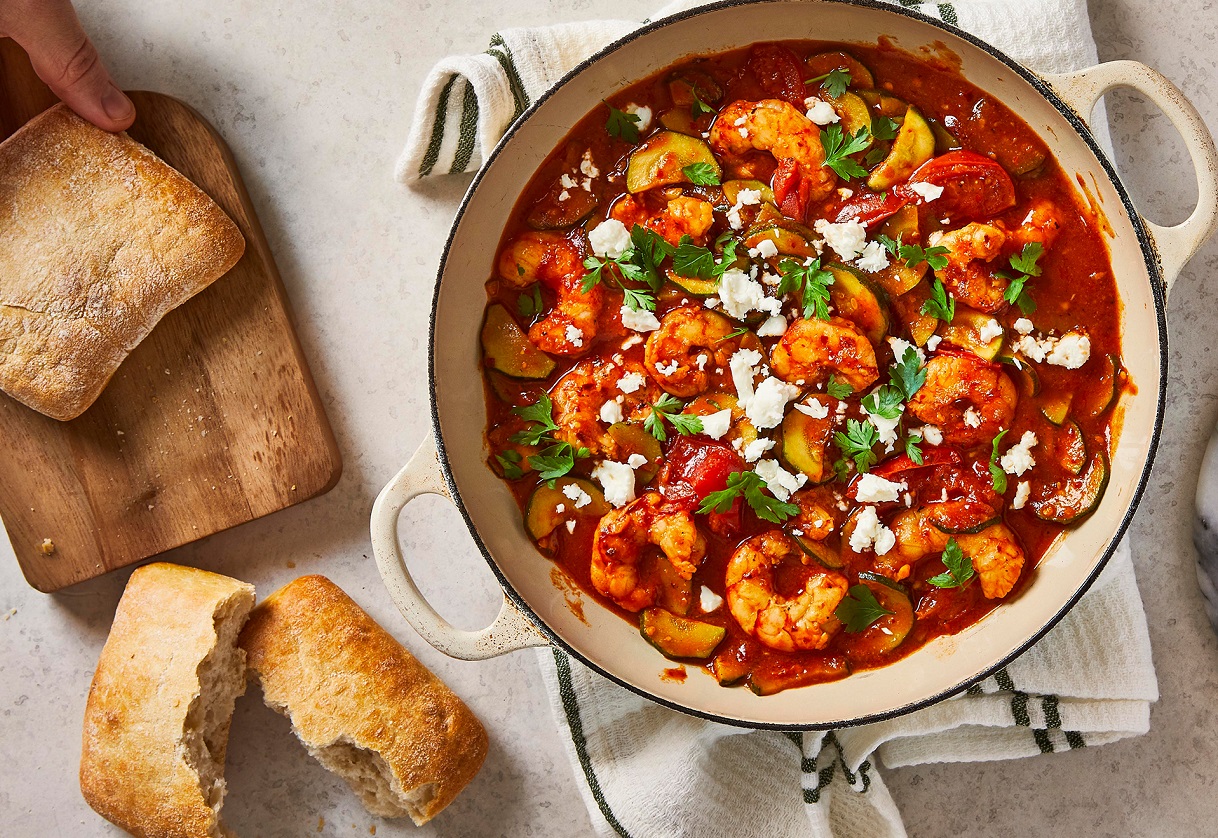 Приготовьте креветки «Саганаки» по-гречески за считанные минуты. Креветки обжариваются в оливковом масле вместе с овощами и специями, а затем томятся в ароматном соусе. Подается блюдо с хрустящей чиабаттой и сыром Фета.