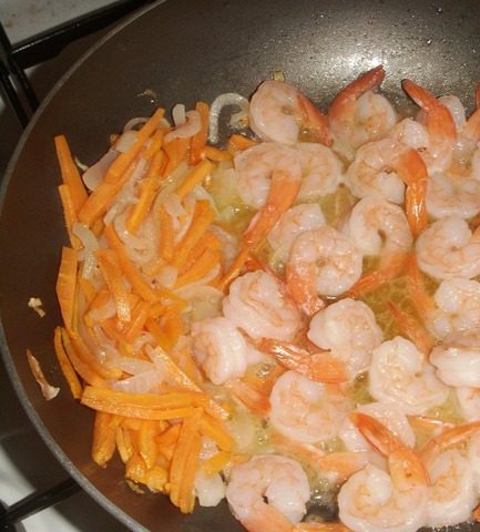 - Обжарить на сковороде овощи затем добавить креветки, жарить еще 5 минут.
