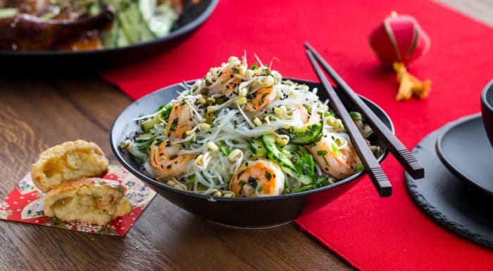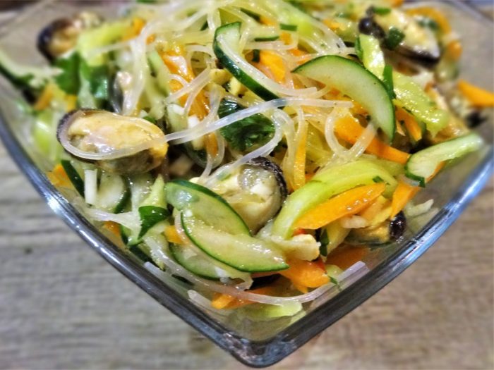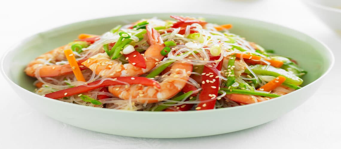 Салат с фунчозой и креветками можно приготовить в жареном варианте, это придаст блюду более изысканный вкус, затем подать в виде закуски или горячего блюдо. Стеклянная лапша с жареными креветками на ужин запомнится надолго, холестерина в таком приеме пищи немного.