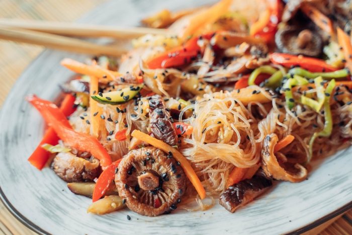 - Финальный этап – добавить стеклянную лапшу и соус, перемешать и обжарить две минуты.